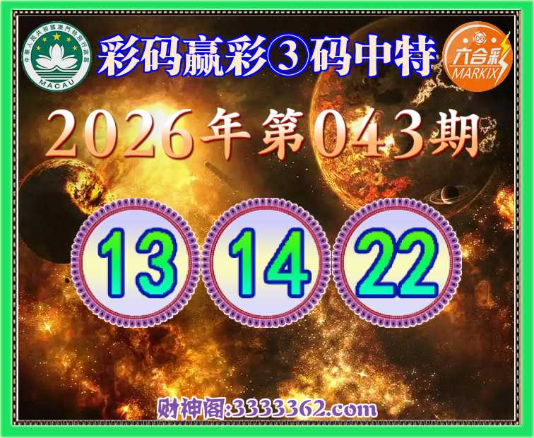 043期:《彩码赢彩》 🎖️③码中特🎖️【13.14.22】开:13